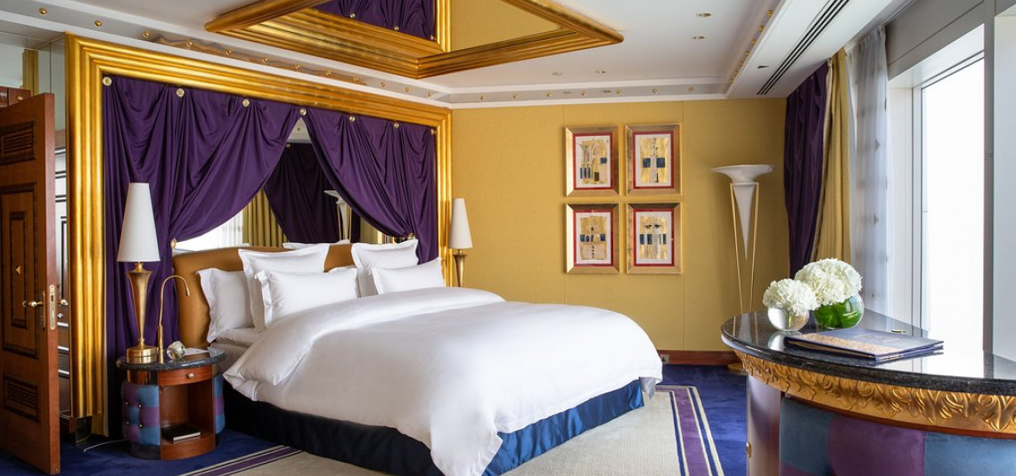 L'hotel offre 28 piani con 202 suite, la più piccola delle quali misura 169mq mentre la più grande raggiunge i 780mq. L'est incontra l'ovest negli alloggi del Burj Al Arab che presenta eleganti colonne bianche e accenti di piastrelle a mosaico nei bagni.