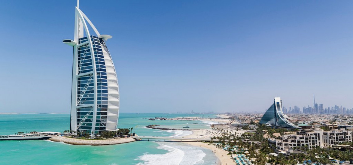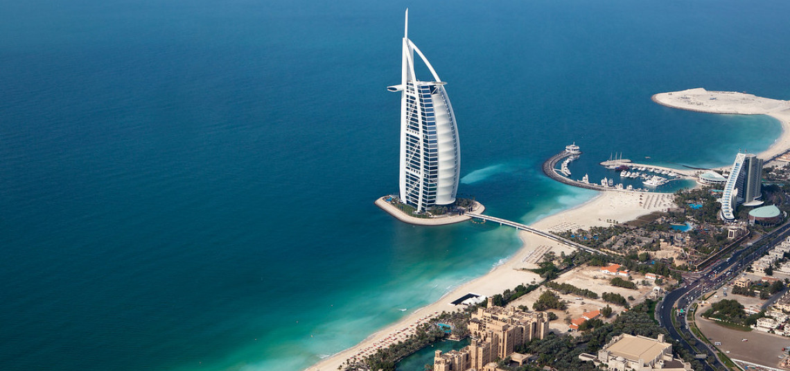 Il Burj Al Arab è un hotel di lusso a 7 stelle, che sorge su un’isola artificiale distante circa 300m dalla spiaggia di Jumeirah a Dubai. Fu aperto nel 1999 e fu progettata per somigliare ad una vela di una nave araba, conosciuta come ‘’dhow’’.