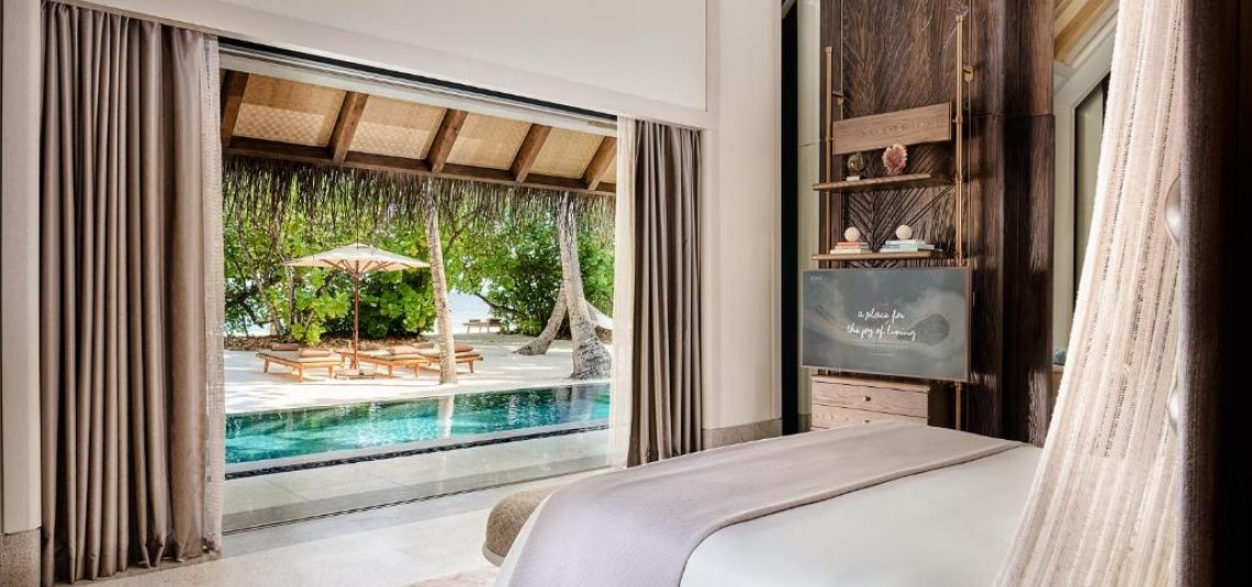 Le sistemazioni di JOALI sono vere e proprie opere d’arte: ville spaziose costruite con materiali naturali e sostenibili, immerse nella vegetazione tropicale o sospese sull’acqua cristallina. Ogni villa – con una, due o più camere da letto – dispone di piscina privata, terrazza solarium, servizio maggiordomo personalizzato e accesso diretto alla spiaggia o alla laguna. Gli interni, curati nei minimi dettagli, fondono eleganza moderna e tocchi artigianali locali, offrendo un’atmosfera calda e raffinata.